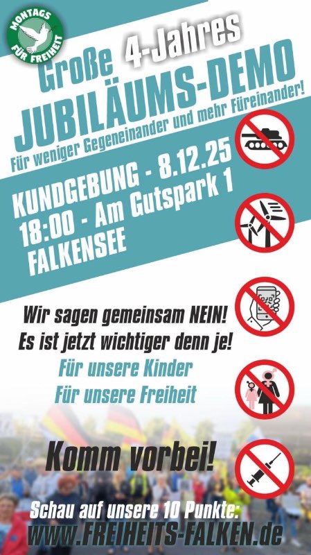 Die FREIHEITS-FALKEN setzen ein Zeichen für Toleranz in unserer Gesellschaft. Wir sind gegen die aufkommende, zunehmend totalitäre Herrschaft in unserem Land und stehen für die Selbstbestimmung sowie für die Wahrung unser aller Grund- und Freiheitsrechte. Dabei bieten Wir einen Rahmen Menschen zu begegnen, uns gegenseitig zu ermutigen und zu unterstützen. Deswegen fordern die FREIHEITS-FALKEN folgende Punkte [Details siehe unten]: